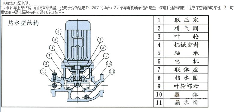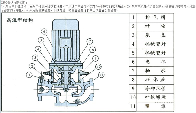 2、IRG(GRG)型立式熱水(高溫)循環(huán)泵廣泛適用于:能源、冶金、化工、紡織、造紙,以及賓館飯店等鍋爐高溫?zé)崴鰤貉h(huán)輸送及城市采用暖系統(tǒng)循環(huán)用泵,IRG型使用溫度T<120℃,GRG型使用溫度T<240℃。