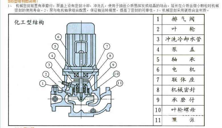 3、IHG型立式管道化工泵,供輸送不含固體顆粒,具有腐蝕性,粘度類似于水的液體,適用于石油、化工、冶金、電力、造紙、食品制藥和合成纖維等部門,使用溫度為20℃~+120℃。