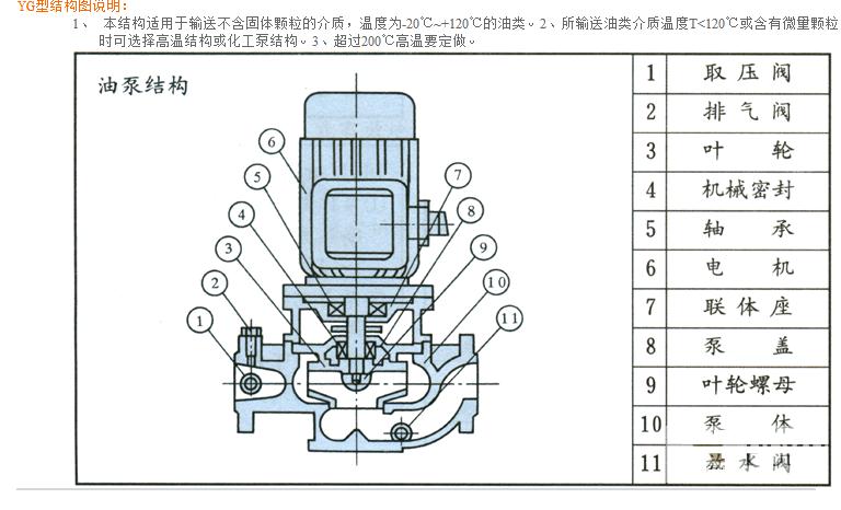 4、YG型立式管道油泵,供輸送汽油、煤油、柴油等石油產(chǎn)品,被輸送介質(zhì)溫度為-20℃~+120℃。