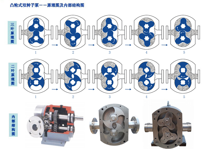 ?轉(zhuǎn)子泵又稱膠體泵,三葉泵,鞋底泵等。依靠?jī)赏椒聪蜣D(zhuǎn)動(dòng)的轉(zhuǎn)子(齒數(shù)為2-4)在旋轉(zhuǎn)過(guò)程中于進(jìn)口處產(chǎn)生吸力(真空度),從而吸入所要輸送的物料。兩轉(zhuǎn)子將轉(zhuǎn)子室分隔成幾個(gè)小空間,并按a→b→c→d的次序運(yùn)轉(zhuǎn)。運(yùn)轉(zhuǎn)至位置a時(shí),只有I室中充滿介質(zhì);?到位置b時(shí),B室中封閉了部分介質(zhì);?到位置c時(shí),A室中也封閉了介質(zhì);?到位置d時(shí),A、B室與Ⅱ室相通,介質(zhì)即被輸送至出料口。如此循環(huán)往復(fù),介質(zhì)(物料)即被源源不斷地輸送出。