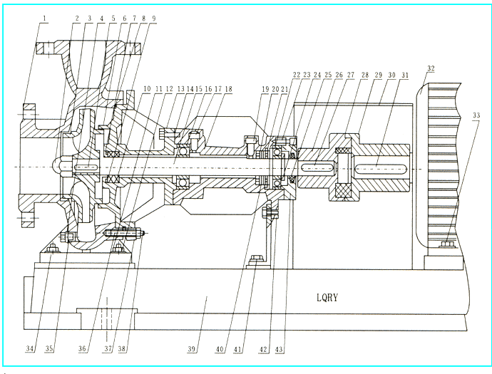 LQRY系列熱油泵的支撐采用了雙端球軸承支撐的結(jié)構(gòu)形式,前端采用潤滑油潤滑,后端采用潤滑脂潤滑,中間有一導(dǎo)油管,用以隨時(shí)觀察密封情況和回收導(dǎo)熱油。