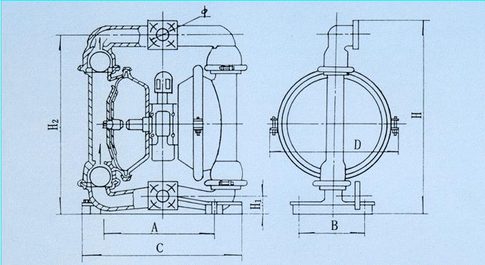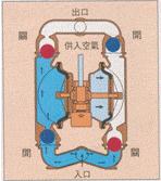 圖1:空氣經(jīng)由氣閥壓縮進(jìn)入膜片A之背面,由膜片擠壓液室。此種以空氣驅(qū)動(dòng)的方式可免除一般活塞驅(qū)動(dòng)之機(jī)械應(yīng)力,從而顯著地延長(zhǎng)膜片的壽命。在壓縮空氣將膜片A推離中心體時(shí),另一端之膜片B同時(shí)被連結(jié)之中心軸拉向中心體,此時(shí),膜片B背面之空氣由出口排放到泵體外。如此使B室形成真空狀態(tài),因而能靠外面大氣壓力之作用將流體由入口支管將閥球推離閥座使流體能自由地進(jìn)入B室直至填滿。