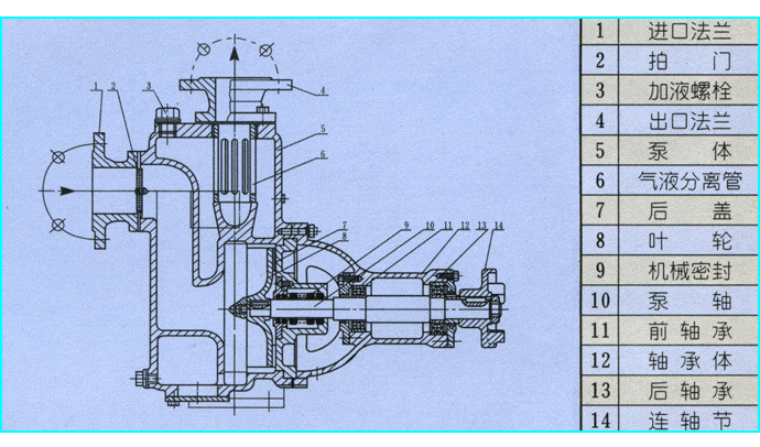 泵的工作原理:泵體內(nèi)設(shè)有儲液腔,并通過上方的回流孔和下方的循環(huán)孔與泵工作腔相通,構(gòu)成泵的軸向加流外混式系統(tǒng)。泵停止工作后,泵內(nèi)腔已儲有一定容積的液體。當(dāng)泵起動時(shí),有關(guān)當(dāng)局內(nèi)的儲液在葉輪的作用下,夾帶著空氣被向上拋出,液體通過氣液分離管的網(wǎng)格回流到工作腔,氣體被排出泵外,使泵內(nèi)形成一定的真空度,達(dá)到自吸的作用。